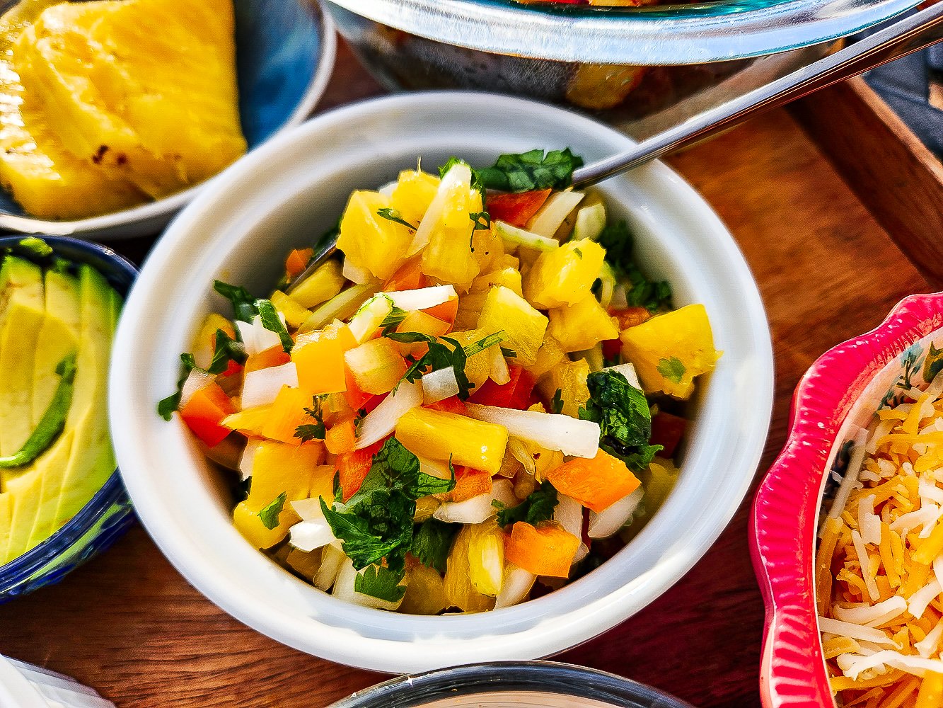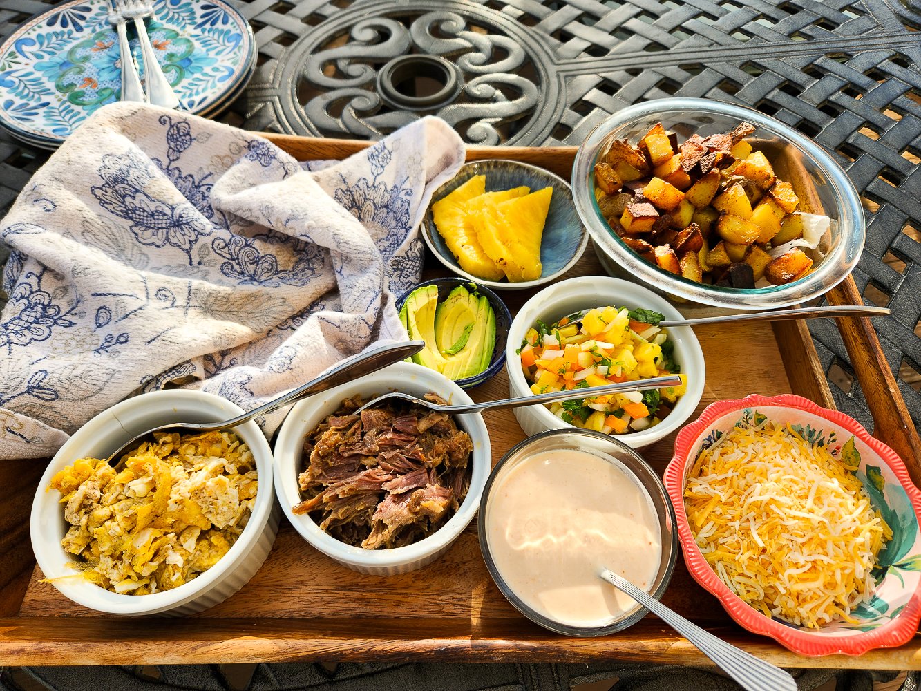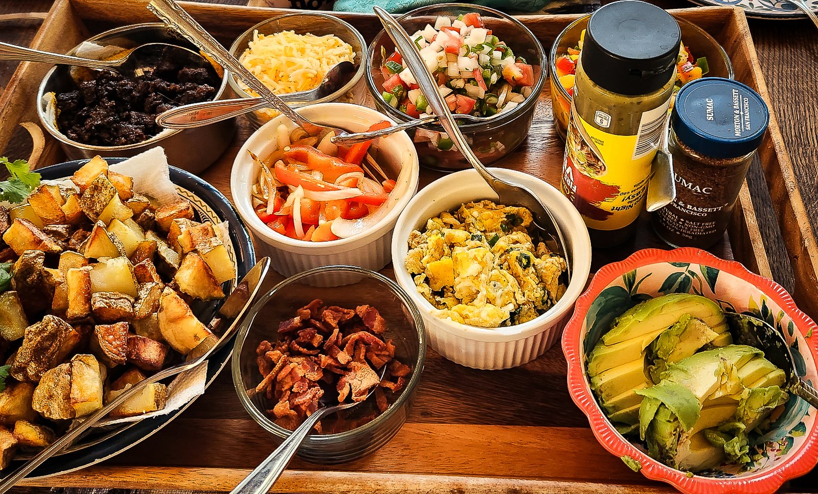 Our breakfast tacos make everyone happy! Adults and children from around the world love our “everything from scratch” breakfast tacos. We provide a choice of meat or tofu with corn and/or flour tortillas. Then we serve it up on a tray with seasoned breakfast potatoes, scrambled eggs, homemade pico de gallo and/or fresh salsas, cheese, sour cream or crema & sliced avocado so everyone get to build their own. It’s one of our most popular breakfast choices!